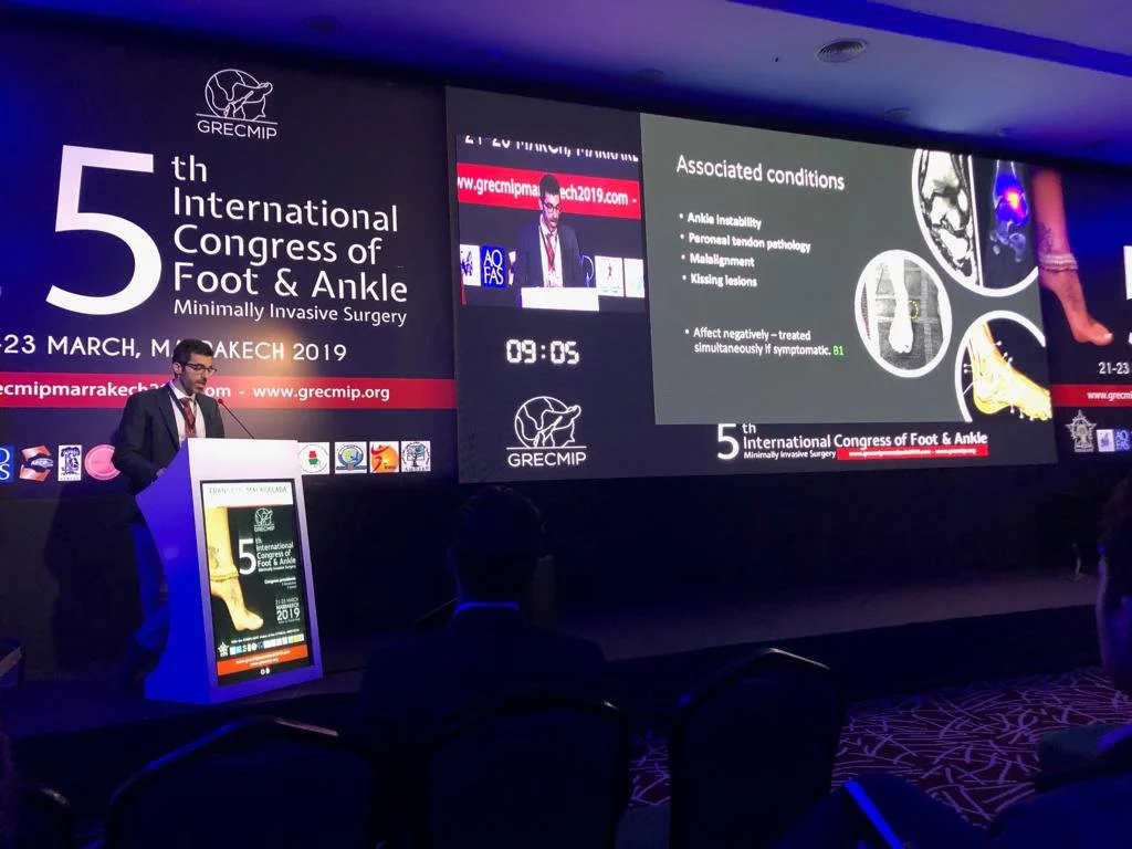 Mr Malagelada - Speaker presenting at the 5th International Congress of Foot & Ankle in Marrakech, March 2019, with a focus on minimally invasive surgery. The presentation slide lists associated conditions like ankle instability and tendon pathology.